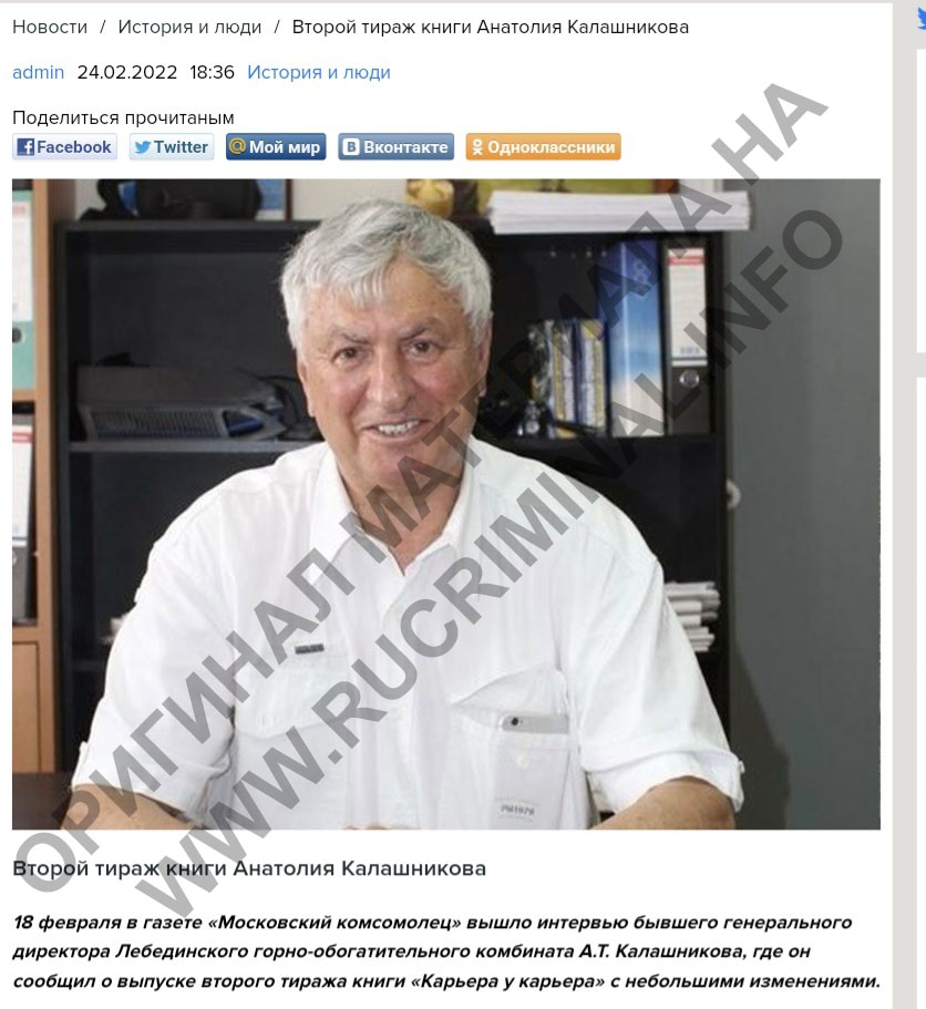 Понятно, что представители «Металлоинвеста» Усманова мигом скупили весь тираж. А следом, нейтрализовали, и Калашникова. Неожиданно в один день в МК, Собеседнике и куче других СМИ вышли интервью с Калашниковым, из серии «меня неправильно поняли», в которых он восхвалял Усманова. А одному изданию из Оскола Калашников признался, что вскоре будет выпущен второй тираж книги «Карьера у карьера», но «с небольшими изменениями». Изменения эти, конечно, известны. Усманов в книге превратится из отрицательно героя во второго «отца-основателя» завода.